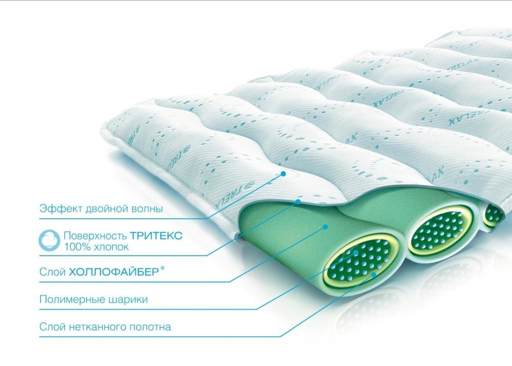 Матрас ортопедический Trelax М80/190 помогает придать правильное положение позвоночнику во время сна или отдыха.Продольные и поперечные волны, а также шарики пенополистирола внутри матраса, обеспечивают массажный эффект. Кроме того, “эффект двойной волны” помогает растяжению позвоночника и нормализует мышечный тонус. Матрас нормализует кровообращение в мышцах и связках позвоночника. Внутренний слой матраса состоит из нетканого полотна - холлофайбер, поверхность матраса покрыта мягкой тканью с волокнами вискозы.